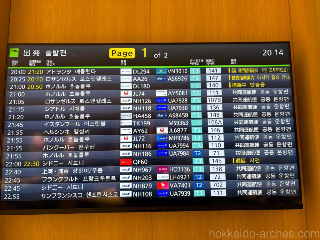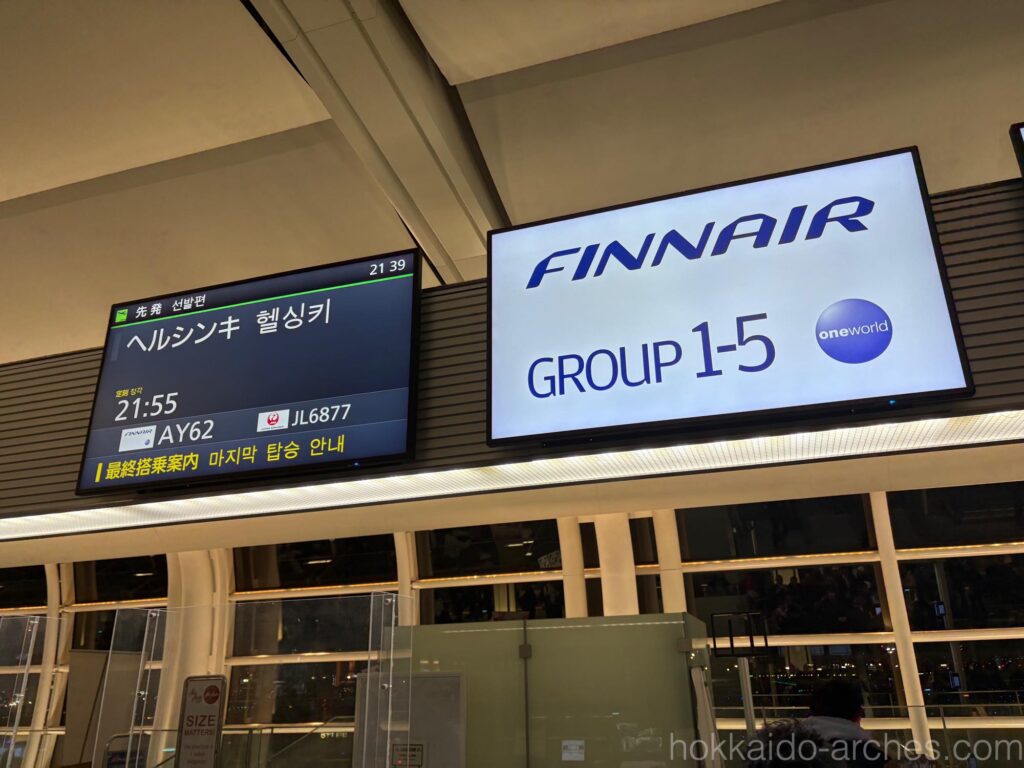 楽しそうな行き先の並ぶ案内板。今回搭乗するのは21:55発のフィンランド航空ヘルシンキ行きです。最終目的地のトロムソへは、ヘルシンキで乗り継ぐことになります。