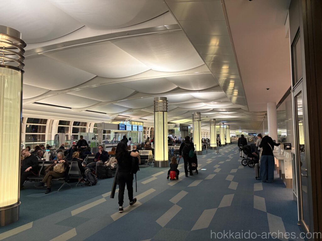 出国前から「海外価格」の洗礼を受けつつも、羽田空港で至福の時を過ごしていると、いよいよ出発の時間です。出国手続きや搭乗手続きを済ませ、メンバーとも合流して、飛行機へ向かいます。