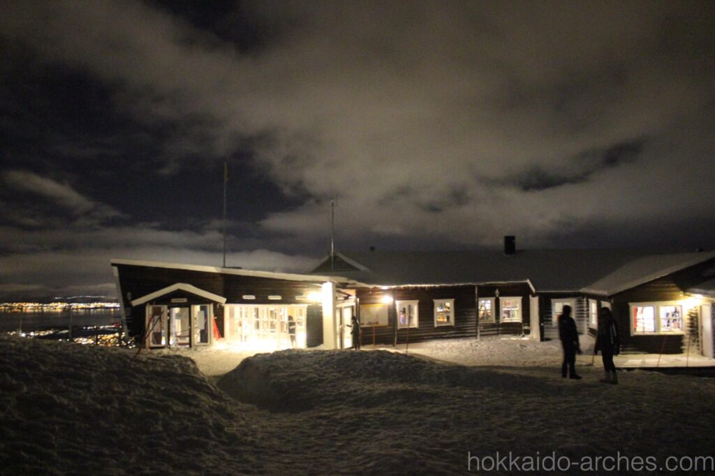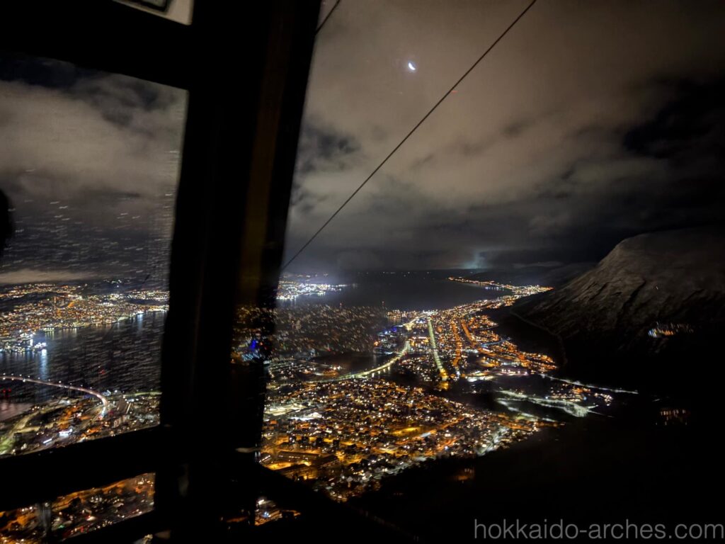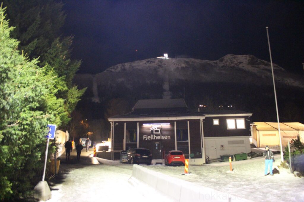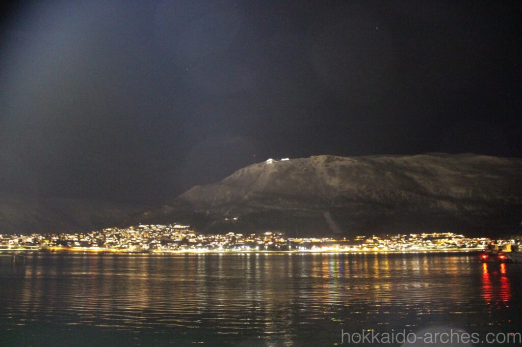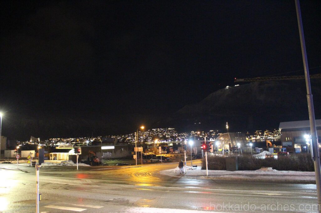 右上の山の上に灯りが見えます。あそこが展望台です。オーロラを見たければ普通に空を見上げればいいんじゃない??と言われそうですが、トロムソの町はかなり明るく、街中からのオーロラはかなり厳しそうなのです。あの山の上であれば、光もあまりなく、オーロラを拝める可能性がありそうです。