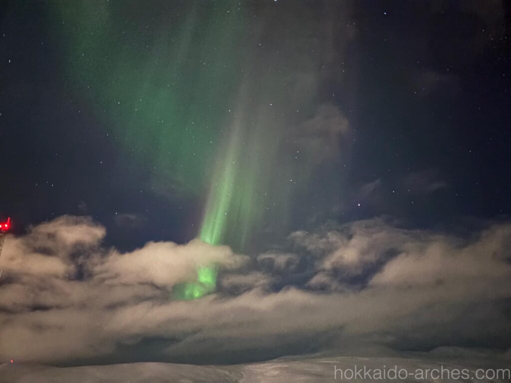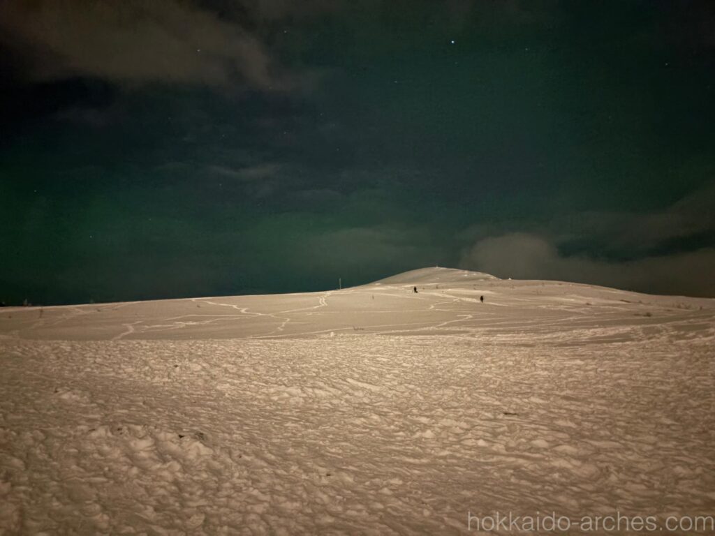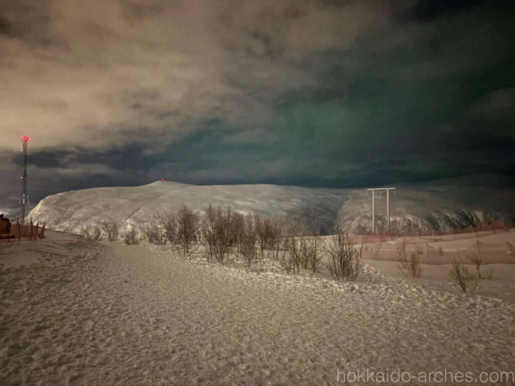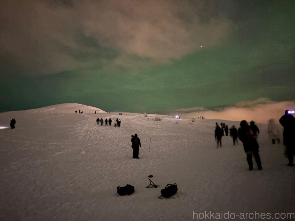 なんと初日の夜にして早くも見られてしまいました。オーロラです。山頂にいる人の様子だと、これまではオーロラは見えていなかったのですが、我々が山頂に着くのと同時に出始めたようです。空も我々の訪問を歓迎してくれたのでしょう。