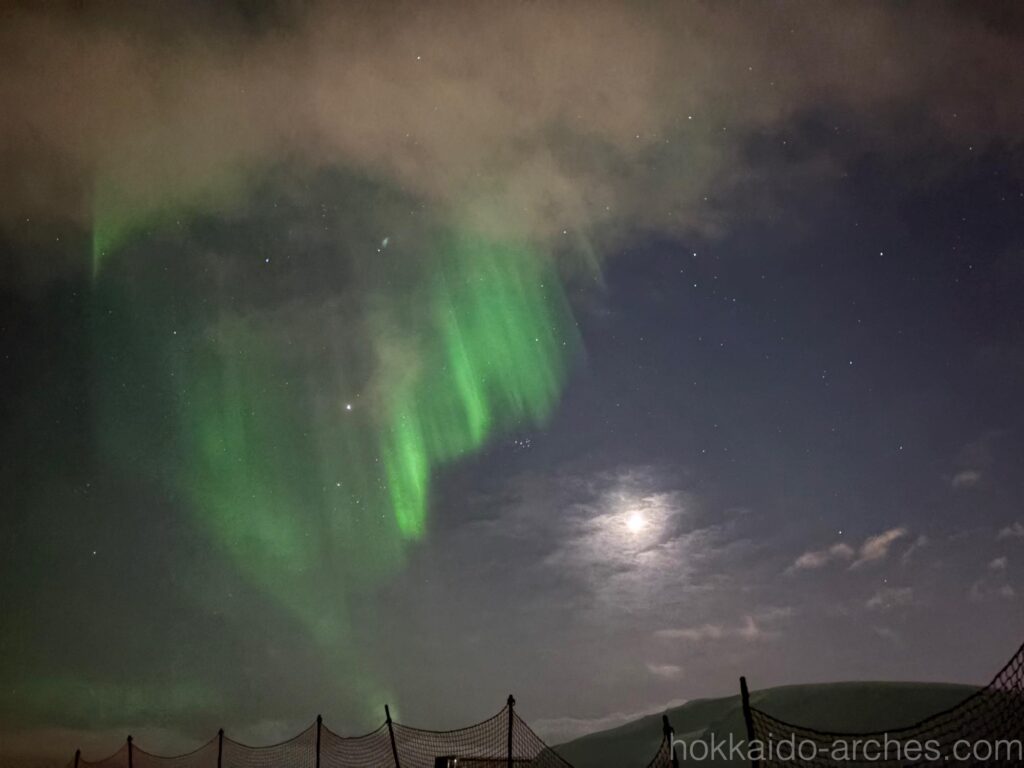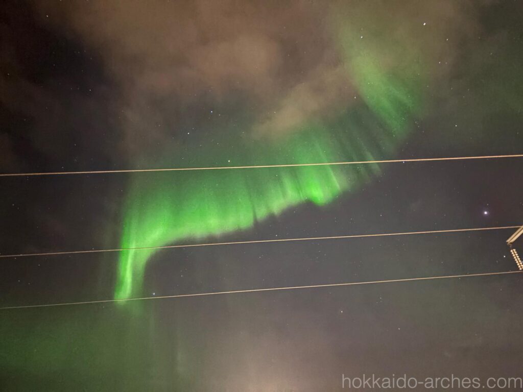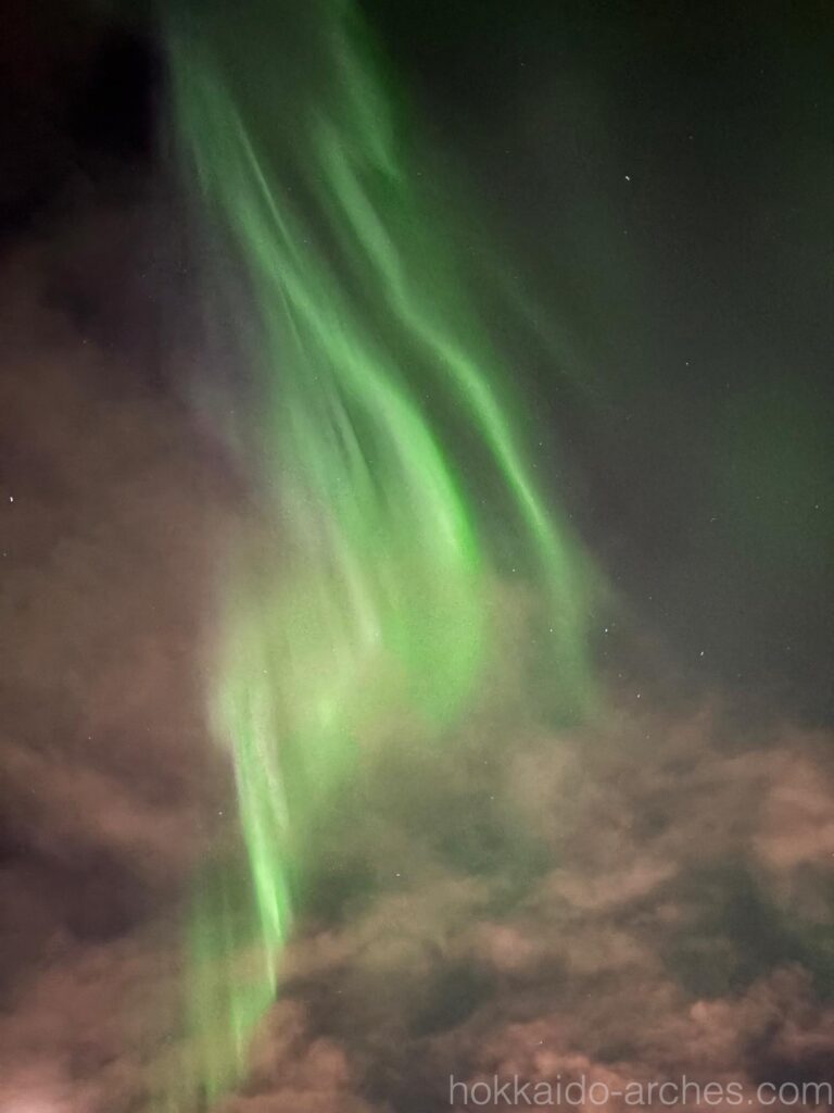ウェルカムオーロラは、短い時間の間に刻々とその姿を変えていきます。縦に広がったかと思えば横に広がり、一旦姿を消してまた現れたり。まるで生き物のようにダイナミックな動きをします。だからシャッターチャンスがかなり難しいです。