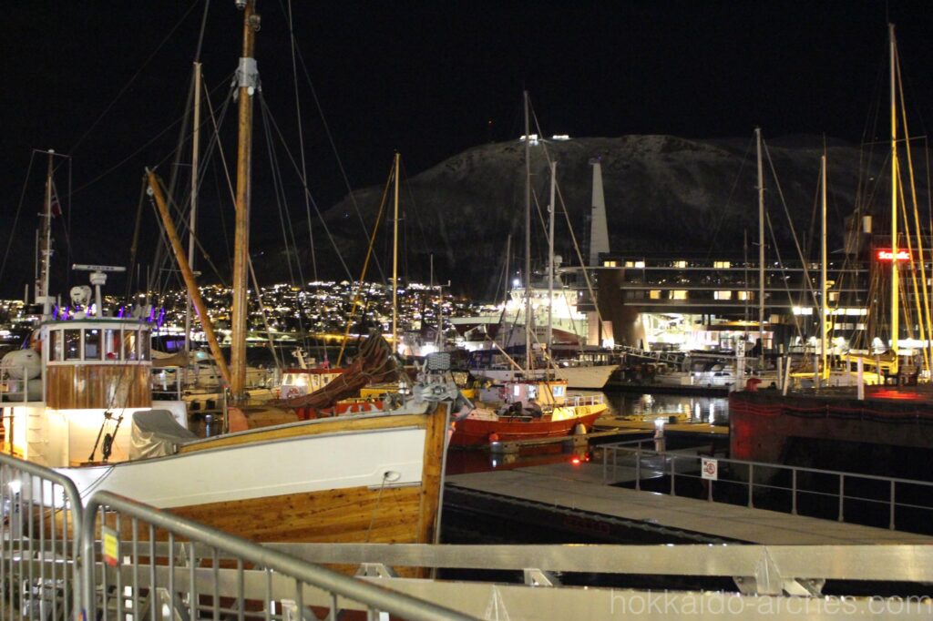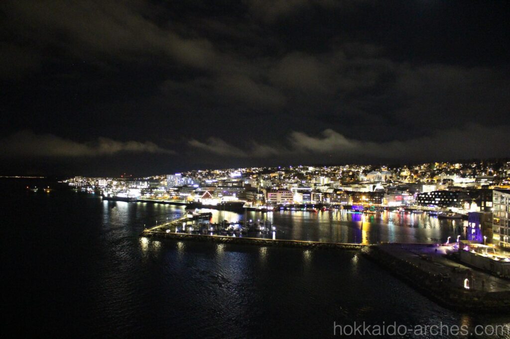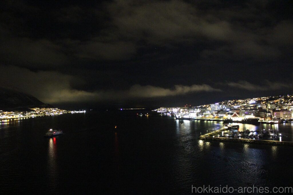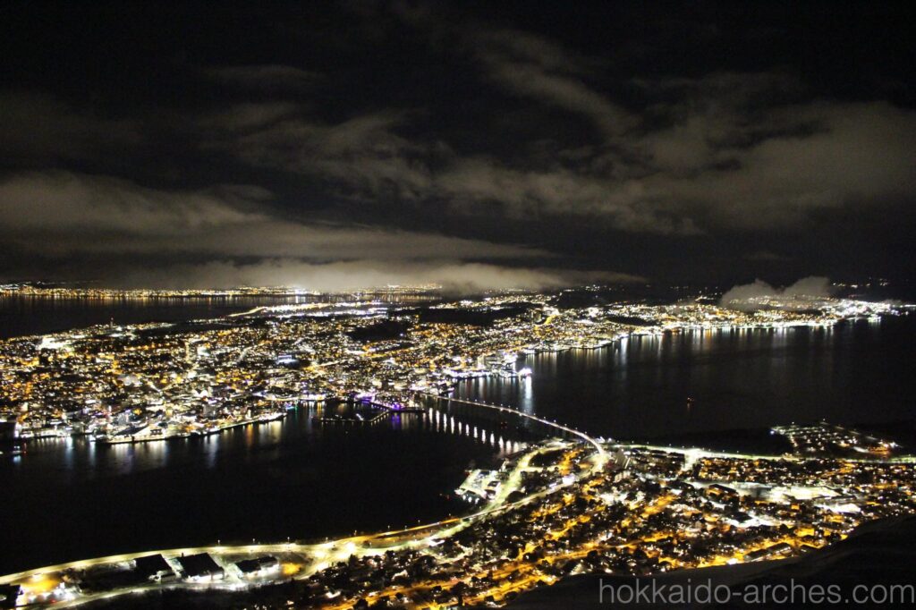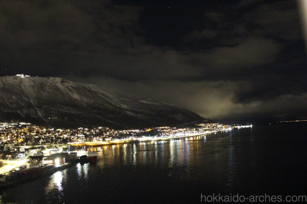 初めて見るオーロラに感動して忘れてしまいそうでしたが、夜景も見なければなりません。しかしこちらも息を呑むような美しさです。北の果て、北緯70度にこんなに美しい町が広がっているなんて感激です。函館の夜景よりも1ランク2ランクくらい素晴らしい夜景だと思いますが、世界三大夜景の一つにも数えられておらず、「夜景の美しい町」としての知名度はほとんどないのではないでしょうか。きっとトロムソのアクセスが良くないから、マイナースポットだからだと思います。世界にはきっと、「知られていないけどすごい場所」がもっともっとたくさんあるのでしょう。ぜひ足を運びたいものです。