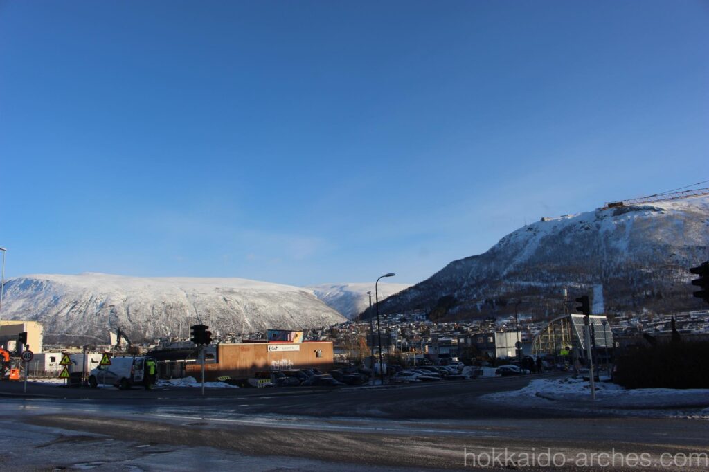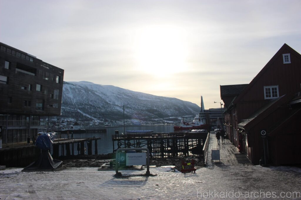 船も当たり前のように水面を走っています。一見普通の風景のように見えますが、北緯70度の町で、冬季でも港が凍らないのは非常に珍しいです。北の果てである証拠に、時刻は正午なのに、太陽はこの位置です。1月などの真冬は1日中全く太陽が昇らない「極夜」になるトロムソですが、3月ともなれば日の出、日の入りは割と普通の時間です。それでも、一番太陽が高い時でもまるで夕方のような風景に、正真正銘、本当に北に来ているのだと実感しますね。