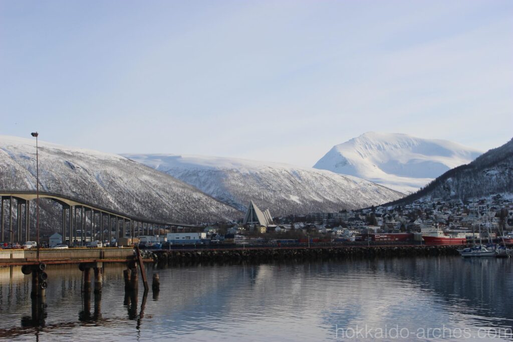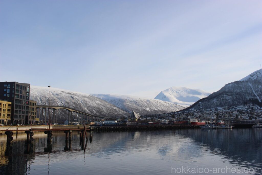 遠くの雪山と、トロムソ橋、そして三角屋根の北極教会。トロムソを代表する景色の一つです。