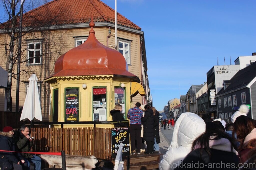 次に少し遅めのお昼を食べることにします。小さなキノコのような建物には行列ができています。ここ、実はかなりの有名店で、トナカイの肉が入ったホットドッグを食べることができます。我々もトナカイの肉が食べたいので、並んでみることにします。