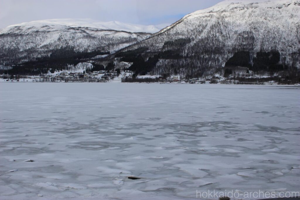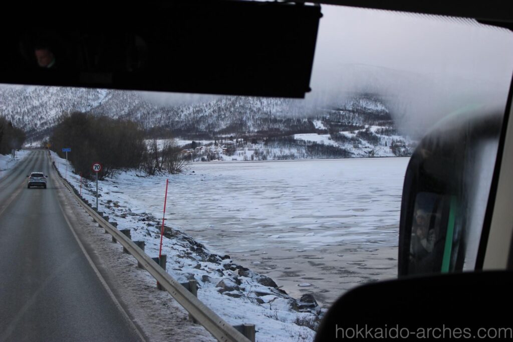 バスはトロムソの街を抜け、自然の中へ走っていきます。バスにはガイドさんがいてくれて、トロムソの案内やその他雑談(漫談?)をしてくれるのですが、それが超マシンガントークで、どこで息つぎをしているのかと思うほど絶え間なく喋り続けています。ただその内容がめちゃくちゃ(ファニーという意味で)面白くて、無駄がなく洗練されたお笑いのネタのようで、一種の感動を覚えてしまうところです。ただその割には乗客の反応は乏しく、きっとマシンガンで話しているから誰も笑うタイミングがないのでしょう。