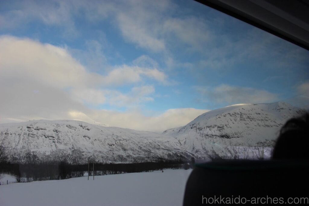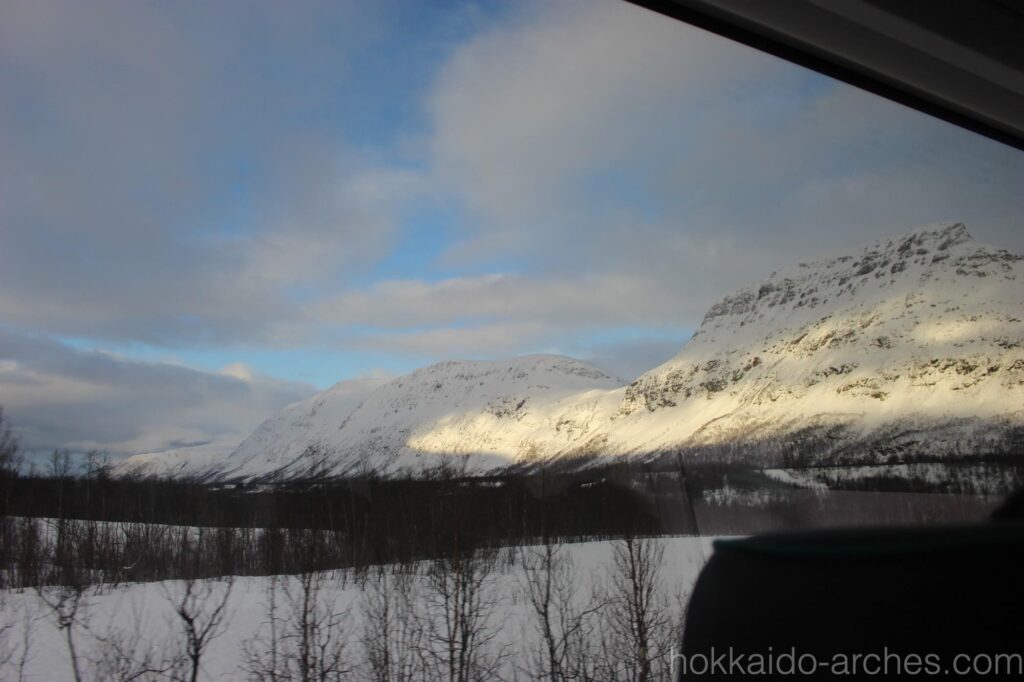 バスの車窓は、北極圏を感じさせるものが続きます。昨日もオーロラハントでこの辺りを通った気もしますが、真っ暗で何も見えなかったですからね。何気ない景色の一つ一つが大迫力です。