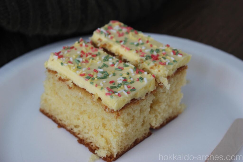 バスの全員が一斉に犬ぞりをやるには犬が足りないので、到着すると2班に分かれることになりました。前半組と後半組です。我々は後半組で、それまで建物の中でケーキを食べながらスタンバイです。
