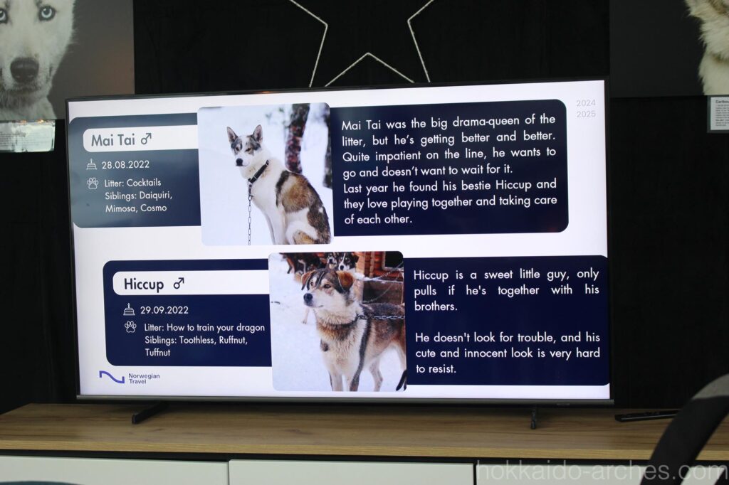 壁際には、ここで飼われているハスキー犬の紹介が書かれています。みんなそれぞれに個性があるんですね。
