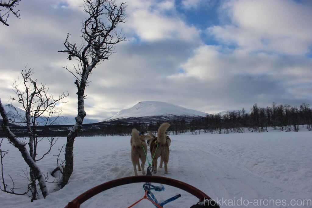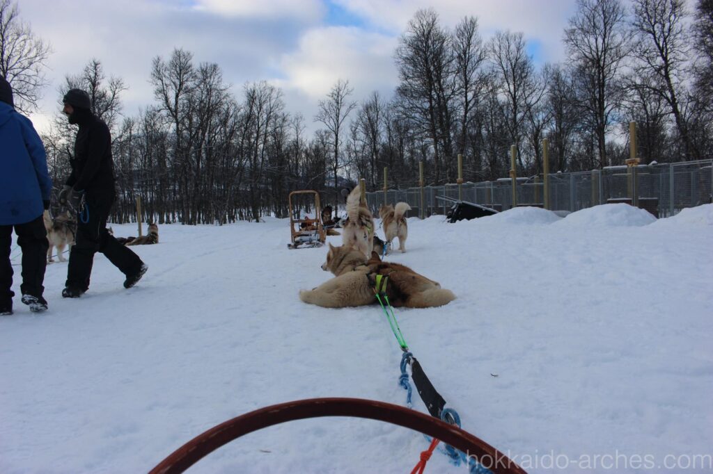 犬ぞりの操縦なんて、やったことがないと難しそうに感じられそうですが、実はそんなこともありません。こういうハスキー犬は頭がいいんですよね。ブレーキを踏めばこっちを見てちゃんと止まってくれたりします。逆もそうで、止まってる状態からちょっと合図を出せばちゃんと走ってくれるのですから、優秀です。こういう体験をすると、犬ぞりが歴史的に使われてきたということは合理的なんだな、と妙に納得してしまうものです。