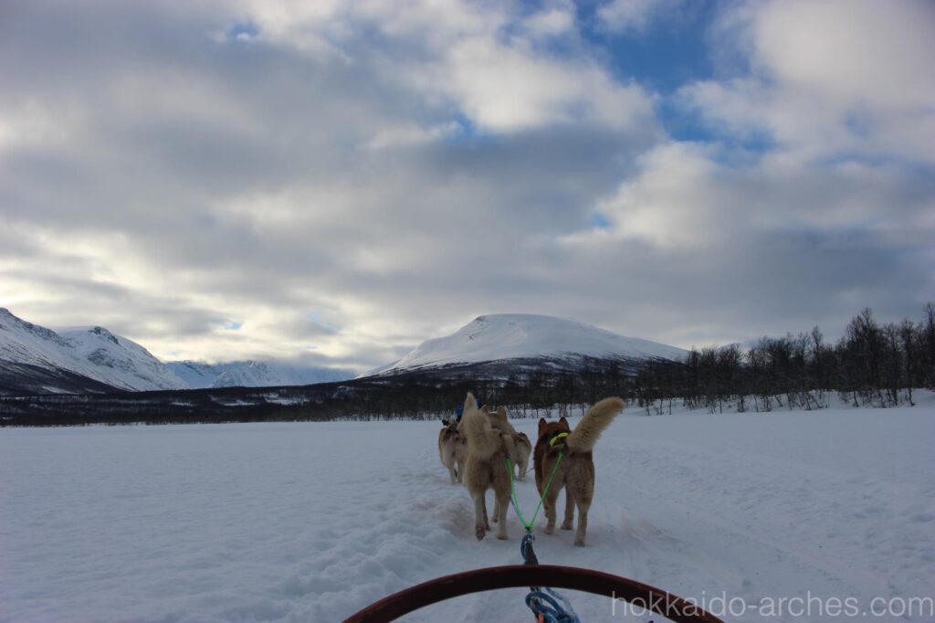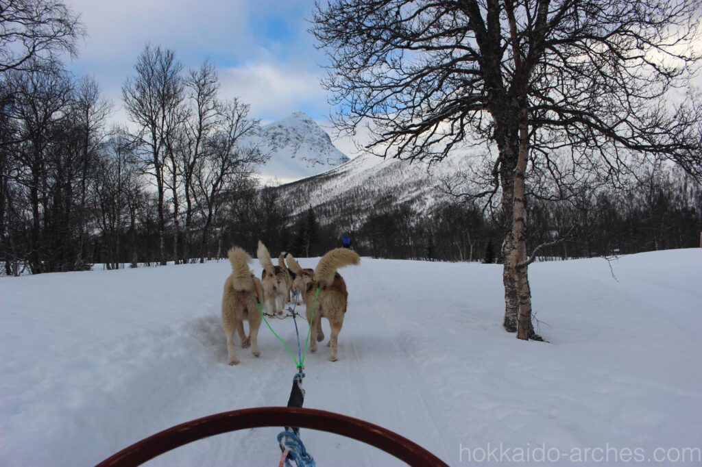 遠くの雪山を眺めながら、雪原を走り、森の間を抜け、坂を登ったり降りたり。でもやっぱり犬に引かれている、ということが、スノーモービルやスキーなどとはまた一味違う、冒険のような楽しさがあります。