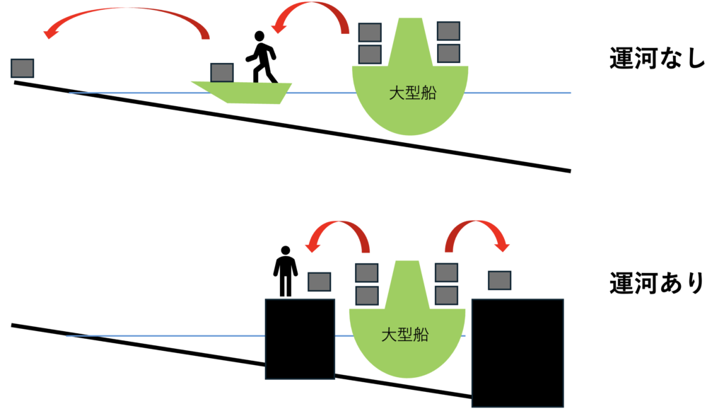 これを解決するために作られたのが運河です。海を埋め立てて運河にし、運河のすぐ脇には倉庫を並べ、大型船から直接倉庫に荷物を出し入れすることができるようにしたのです。イメージとしてはこんな感じです。