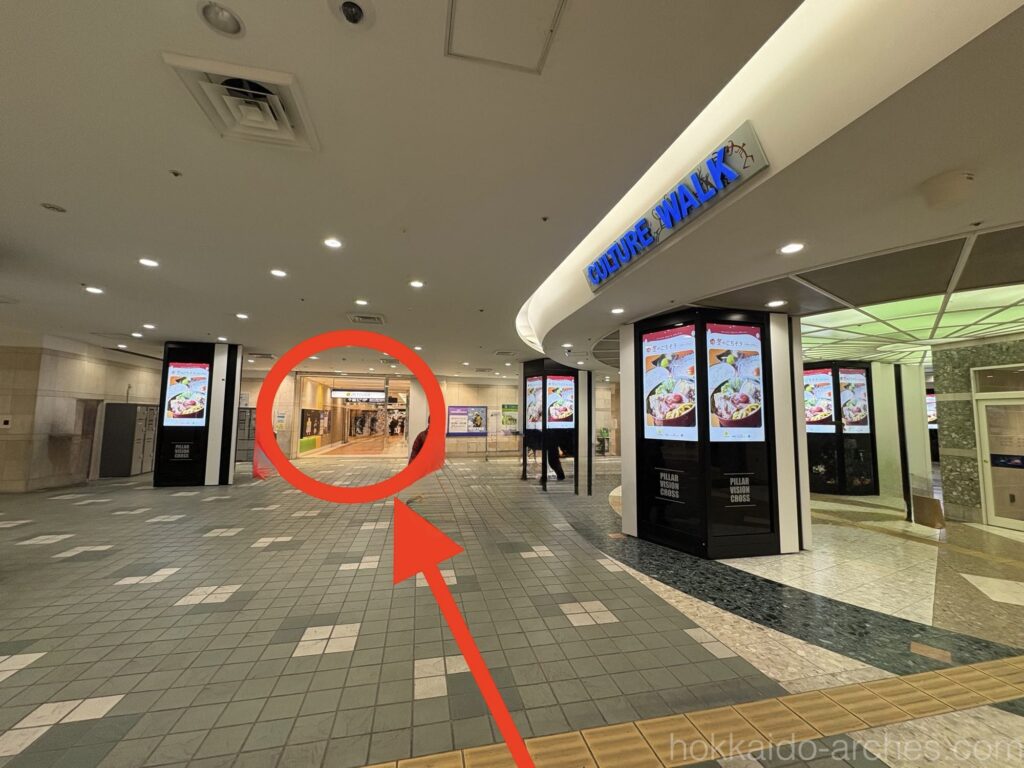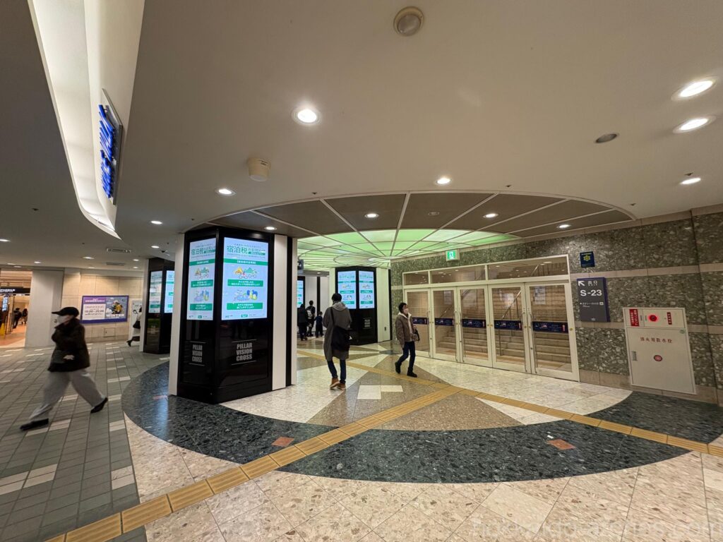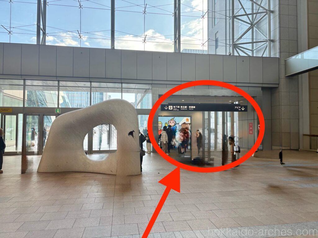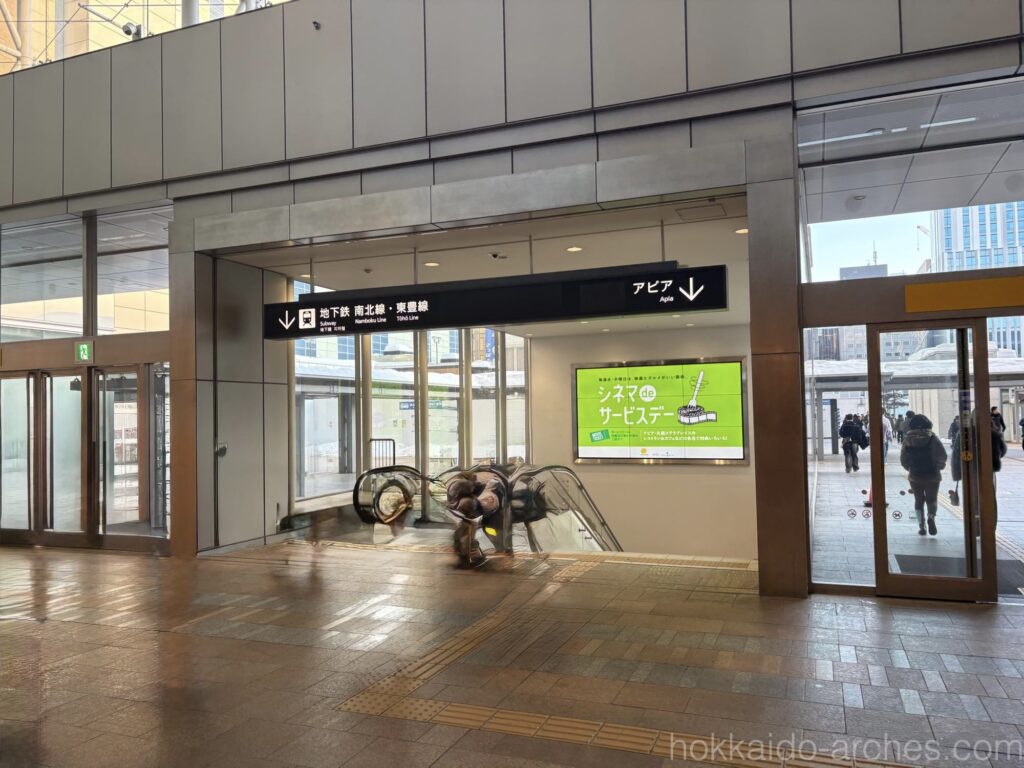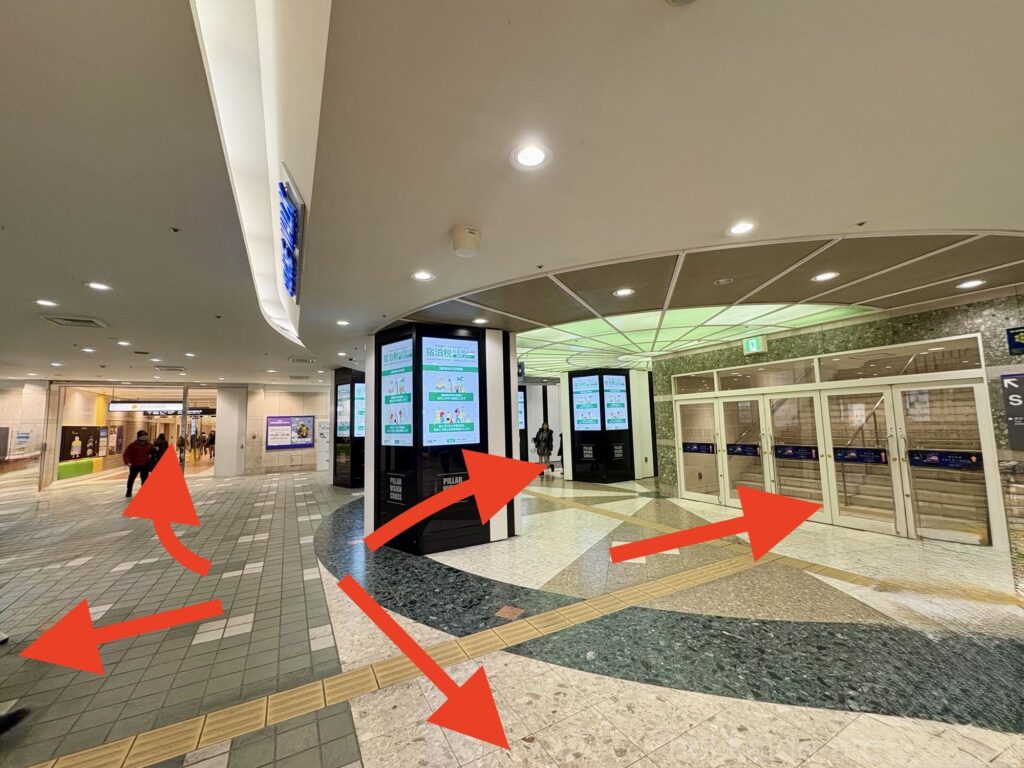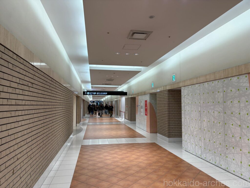 正解は、JRタワー方面です。5つある道のなかで、おそらく一番細い道で、そして一番「らしくない」であろう道が正解なのです。他の道は「地下道」感があるのですが、JRタワー方面だけ「JRタワー内部に繋がる道だから、JRタワー宿泊者・利用者しか入っちゃいけない」感をちょっと感じてしまうのですが、実際はこの道が正解なのです。