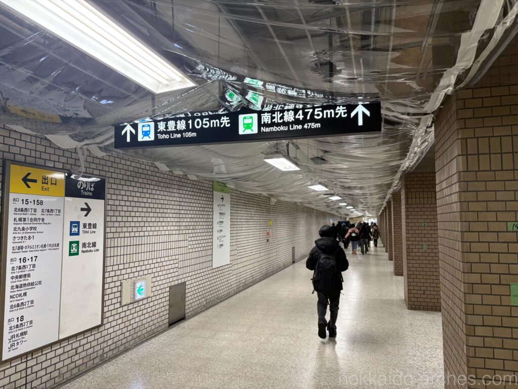 パッと見て、東豊線へはどこにいけばいいのか分からないのです。これまでは、一応「東豊線はこっち!」みたいな看板がありました。でもここに降りると、5つの道があるにもかかわらず、そのうちのどこに行けばいいのかがパッと見て判別がつかないんですよね。
