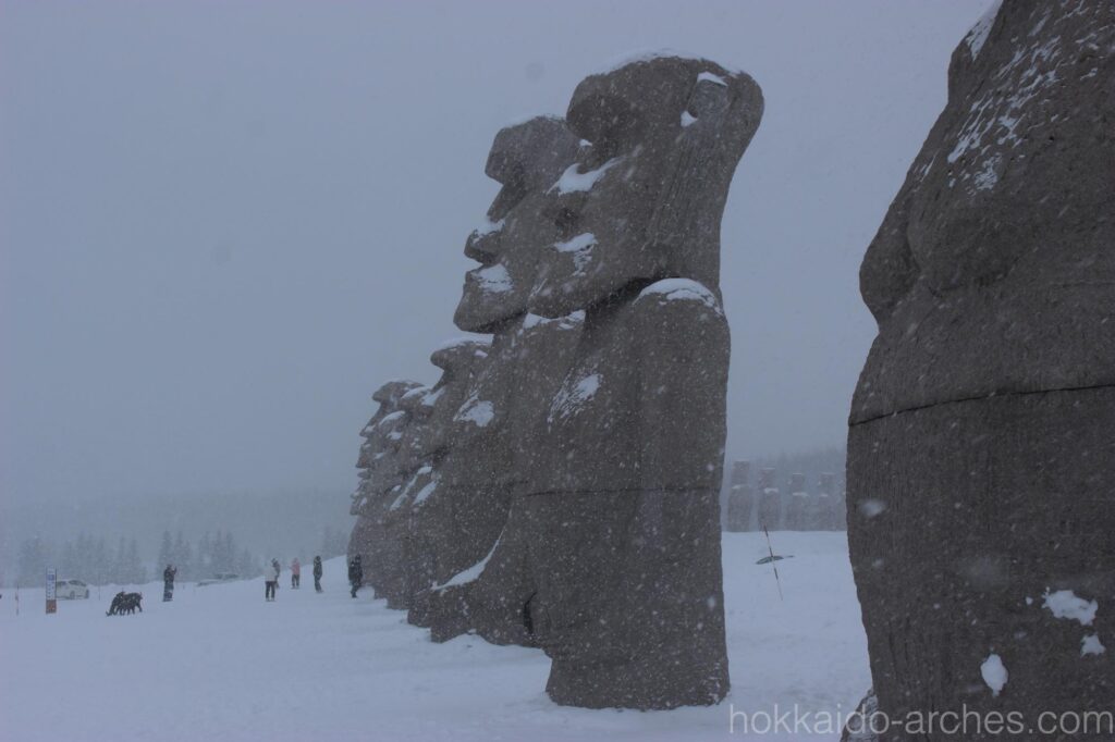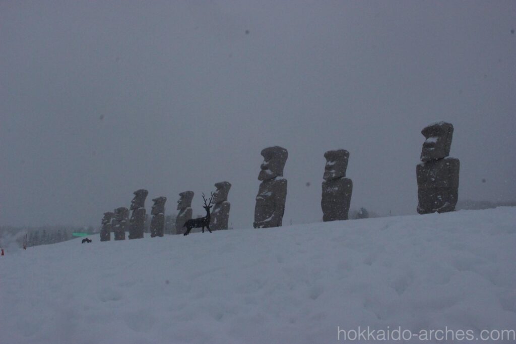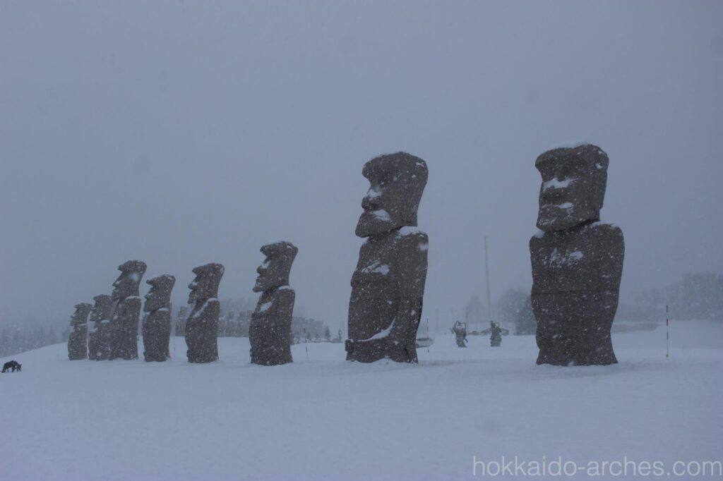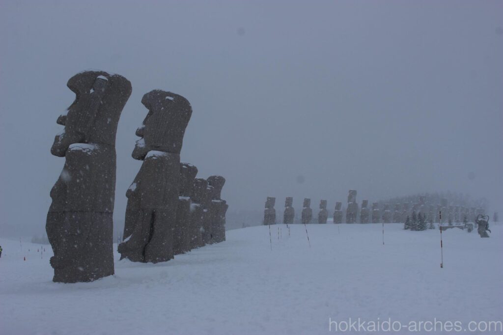 ものすごい数のモアイがあり、その数はおよそ30ほどにもなります。実はモアイは本家・イースター島だけでなく、日本にも数カ所あります。ただ日本のモアイも比較的南の地方に多く、雪景色とモアイの組み合わせは珍しいと言えるでしょう。雪の季節じゃなくても、これだけ大きなモアイがずらっと並ぶ姿が日本のしかも札幌から遠くない場所にあるなんて、びっくりという方も多いのではないでしょうか。